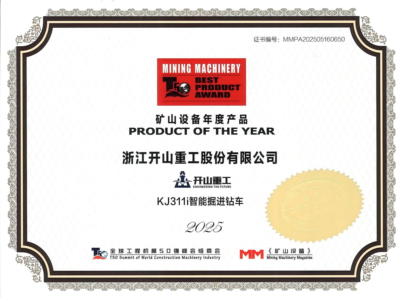 During the conference, a series of authoritative lists in China's mining engineering machinery industry were released. Kaishan Heavy Industry was successfully included in both the "Top 50 Specialized Manufacturers of China's Mining Engineering Machinery in 2025" and the "Top 50 Manufacturers of China's Mining Equipment in 2025" lists, thanks to its outstanding product technology and market influence. The company's independently developed intelligent drilling vehicle, the KJ311i intelligent tunneling drilling vehicle, won the "Mining Equipment of the Year 2025" award.
