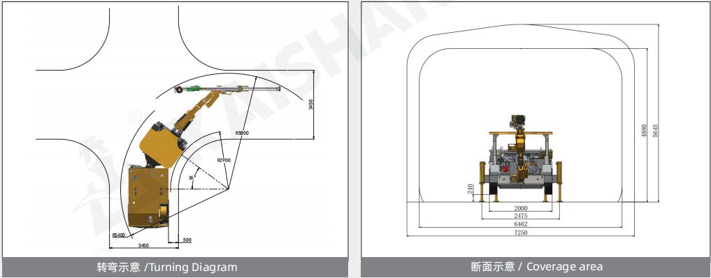 Drill vertical, inclined and horizontal blast holes in low tunnels; Suitable for any tunnels whose section falls in the range of 3.5m*1.8m-5m*4.8m.